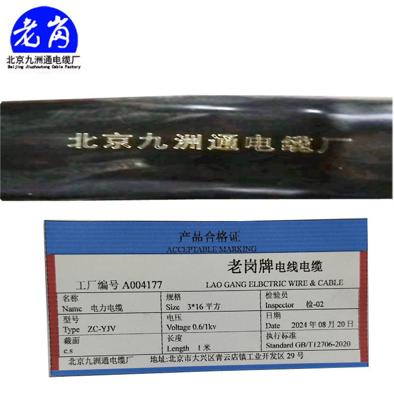 老岗 电力电缆 3芯电缆 阻燃铜芯 ZC-YJV-3*16平方 (米)