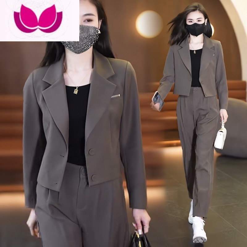 七斓时尚短款西服套装女春2023年新款小个子气质小西装哈伦裤套潮 L106-117斤 2302款咖色