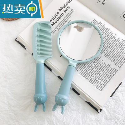 敬平可爱卡通手持化妆镜学生女便携小巧随身手柄梳妆镜美妆镜美容镜子 蓝色梳镜2件套便携式用镜