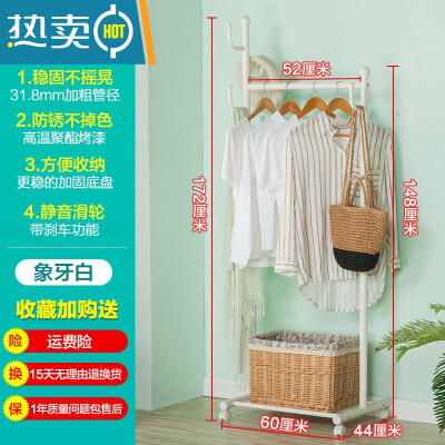 敬平卧室移动晾衣架落地挂衣架铁艺室内单杆小型宿舍衣服架家用衣帽架 象牙白底座网片 60*44*172CM 加固双侧钩底网