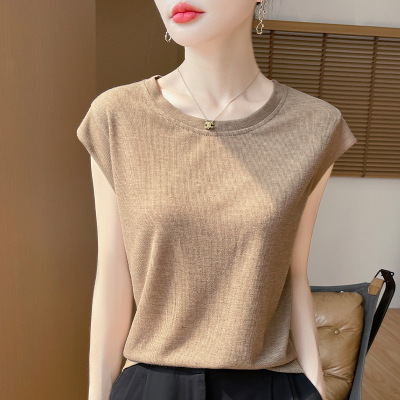 夏季新款圆领飞飞袖T恤女装设计感小众修身百搭无袖纯色上衣