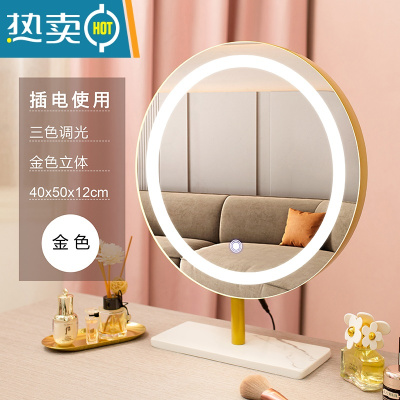 敬平网红台式桌面卧室美妆化妆镜 智能led灯可旋转补光带轻奢灯梳妆镜便携式用镜 40cm大理石金色(固定插电款)