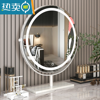 敬平简约台式镜子化妆镜桌面led镜梳妆台带灯家用卧室网红补光梳妆镜便携式用镜 白色边框白色大理石底座-充电款 360°旋
