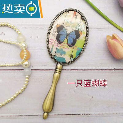 敬平欧式复古青铜金属手柄镜子女化妆镜小号便携随身少女公主圆手持镜 一只蓝蝴蝶便携式用镜