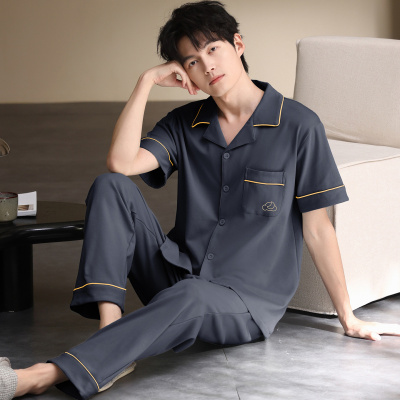 夏季纯棉男士开衫短袖长裤睡衣套装翻领舒适纯色卡通可外穿家居服