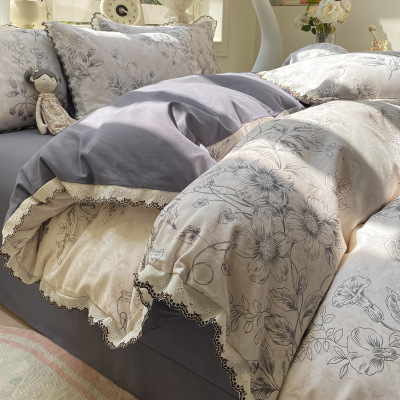 A类纯棉磨毛法式复古花边款四件套印花被套被罩床单3件套