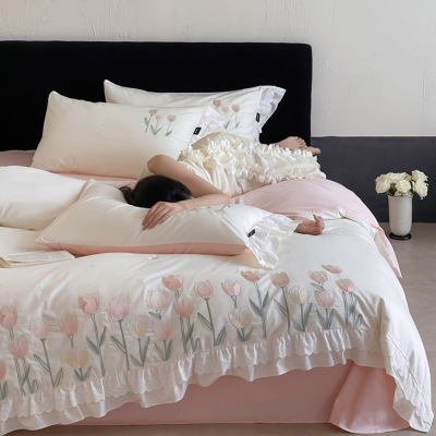 法式轻奢公主风纯棉四件套少女仙女清新花边刺绣被套床单床上用品