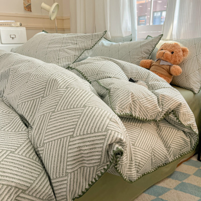 简约A类水洗磨毛床上四件套纯棉针织提花被罩床单绑带款床品3