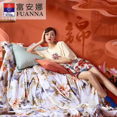 富安娜家纺FUANNA80支长绒棉国风套件纯棉印花床单四件套