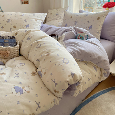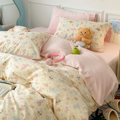 秋冬季A面纯棉B面牛奶绒保暖四件套卡通ins棉加绒加厚被套1.8床单