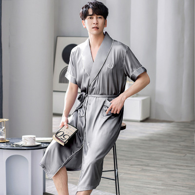 冰丝男士睡袍夏季薄款短袖仿真丝绸睡衣加大码宽松家居服浴袍晨袍