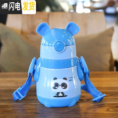 三维工匠卡通可爱儿童吸管保温杯小学生背带饮水杯宝宝带刻度便携户外水壶 蓝色小熊猫/320