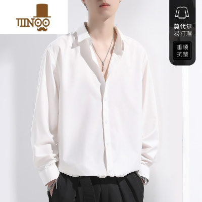 YANXU冰丝衬衫男长袖皱垂感白衬衣宽松夏季薄款休闲痞帅寸衫