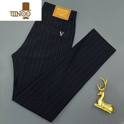 YANXU男士冰丝植绒休闲裤夏季薄款欧货时尚条纹修身直筒裤轻奢速干西裤