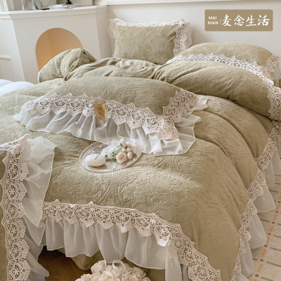 法式仙女牛奶绒四件套公主风蕾丝被套珊瑚绒白色感床裙款冬季
