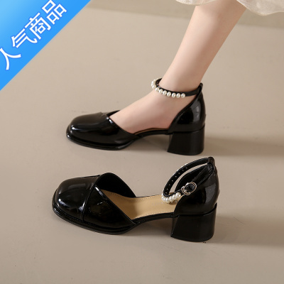 SUNTEK珍珠包头凉鞋女2023年春夏新款漆皮一字扣粗跟仙女风配裙子高跟鞋