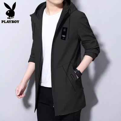 花花公子男士夹克中长款风衣2024新款韩版潮流连帽外套休闲上衣服