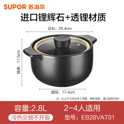 苏泊尔(SUPOR)砂锅陶瓷煲家用砂锅耐高温煲汤锅家用炖锅煲仔饭沙锅养生汤煲明火专用--2.8L
