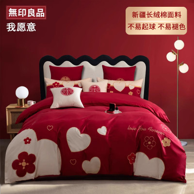 轻奢长绒棉结婚床上四件套婚庆婚礼大红色床单被套高级感床品套件