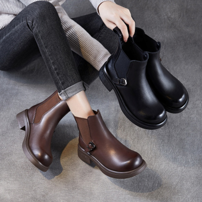 真牛皮切尔西靴女秋季新英伦复古皮带扣马丁靴厚底小短靴单靴