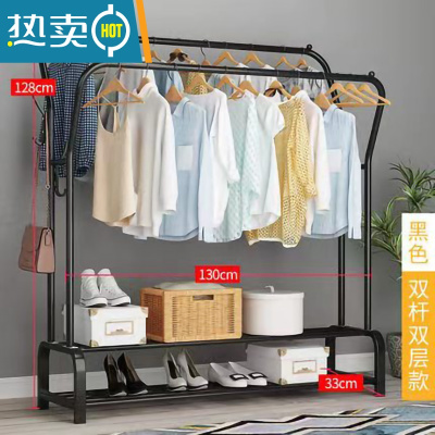 敬平双杆式晾衣架简易衣帽架落地室内置地挂衣架子家用卧室衣服收纳架 [加宽双杆]130cm黑色+双层架 固定底座