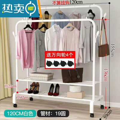 敬平双杆式晾衣架简易衣帽架落地室内置地挂衣架子家用卧室衣服收纳架 [双杆]120cm白色+双层置物网 滑轮底座