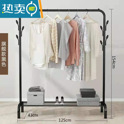 敬平双杆式晾衣架简易衣帽架落地室内置地挂衣架子家用卧室衣服收纳架 [单杆]125cm黑色+单层置物网 固定底座