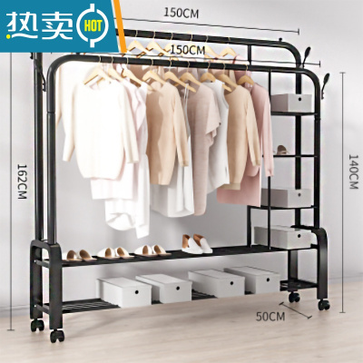 敬平双杆式晾衣架简易衣帽架落地室内置地挂衣架子家用卧室衣服收纳架 [双杆]150cm黑色+双层+侧网 滑轮底座