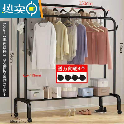 敬平双杆式晾衣架简易衣帽架落地室内置地挂衣架子家用卧室衣服收纳架 [双杆]150cm黑色+单层置物网 滑轮底座