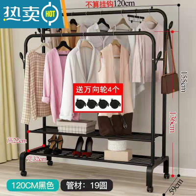 敬平双杆式晾衣架简易衣帽架落地室内置地挂衣架子家用卧室衣服收纳架 [双杆]120cm黑色+双层置物网 滑轮底座