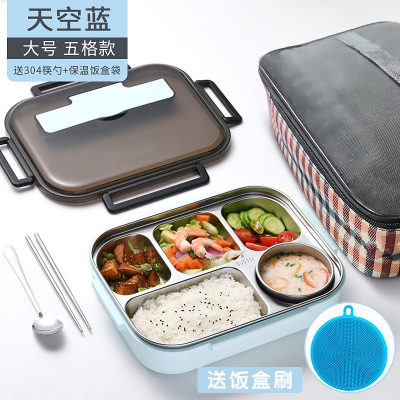 不锈钢茶具学生饭盒上班族餐盒微波炉加热保温儿童便当分隔型餐盘 大号天空蓝5格/送304筷勺+304汤碗+饭盒刷+保温袋
