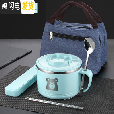 三维工匠304不锈钢饭盒保温学生快餐杯1人便携便当盒儿童女日式上班族饭缸 蓝色饭盒(小熊图案)+304勺筷盒+保温袋