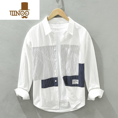 YANXU条纹长袖衬衫男日系薄款内搭青年时尚休闲口袋翻领衬衣男士