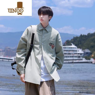 YANXU日系条纹衬衫男秋季潮牌复古宽松刺绣长袖衬衣百搭青少年休闲外套