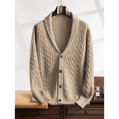 秋冬新款双股加厚羊绒衫男V领开衫复古纯色麻花针织毛衣外套