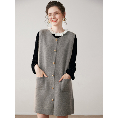 山羊绒开衫马甲女圆领无袖四平加厚口袋中长款坎肩针织打底外套