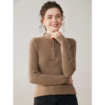 工厂抽条拉链半高领纯色山羊绒针织打底衫女修身外套毛衣女