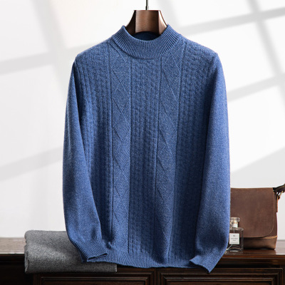 半高领羊绒衫秋冬新款男士席编提花打底衫宽松型加厚套头毛衣