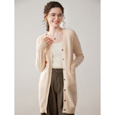 工厂秋冬中长款V领纯色山羊绒开衫女针织打底衫外套上衣毛衣