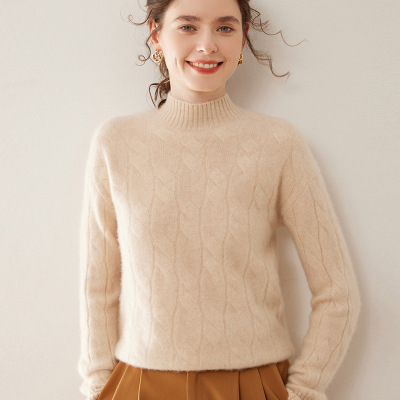 双股加厚羊绒衫女半高领扭花套头毛衣秋冬休闲宽松羊毛针织打底衫
