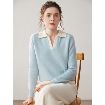 厂家拼色翻领慵懒风山羊绒衫女毛衣针织打底衫显瘦套头上衣