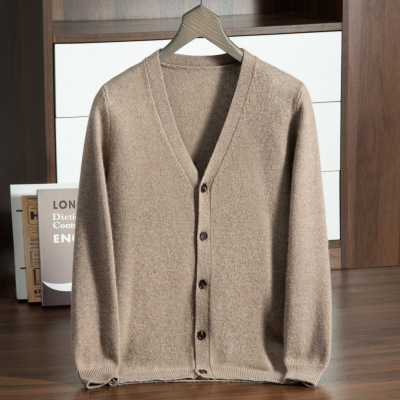 男士七针双股加厚山羊绒衫冬 V领开衫单排扣针织羊毛针织开衫外套