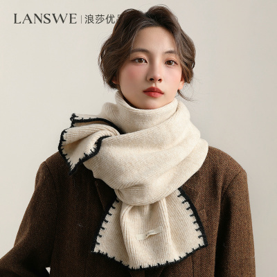 浪莎优品小香风羊毛混纺围巾女冬季针织米色防羊绒保暖围脖礼盒装
