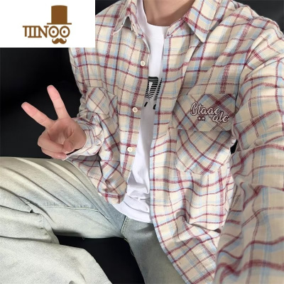 YANXU格子长袖衬衫男款日系复古潮牌刺绣宽松休闲百搭工装衬衣外套