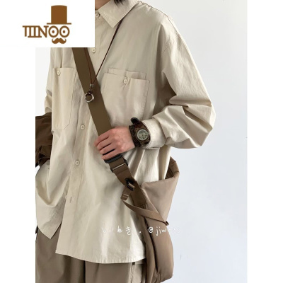 YANXU卡其色工装长袖衬衫男新款潮牌印花休闲上衣男士痞帅衬衣服