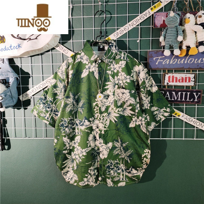 YANXU痞帅花衬衫男港风夏季薄款海边度假男装潮流搭配一套沙滩衬衣套装
