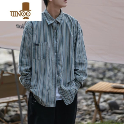 YANXU条纹长袖衬衫男士街头日系复古宽松帅气休闲衬衣高街外套