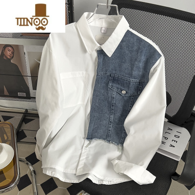 YANXU日系潮牌牛仔拼接长袖衬衫男小众设计感高街情侣宽松休闲白色衬衣