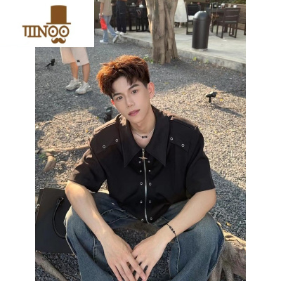 YANXU美式高街小众金属解构设计感衬衫痞帅男宽松拉链短袖衬衣潮牌