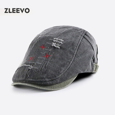 / 拼接做旧鸭舌帽破洞复古水洗前进帽子牛仔贝雷帽刺绣